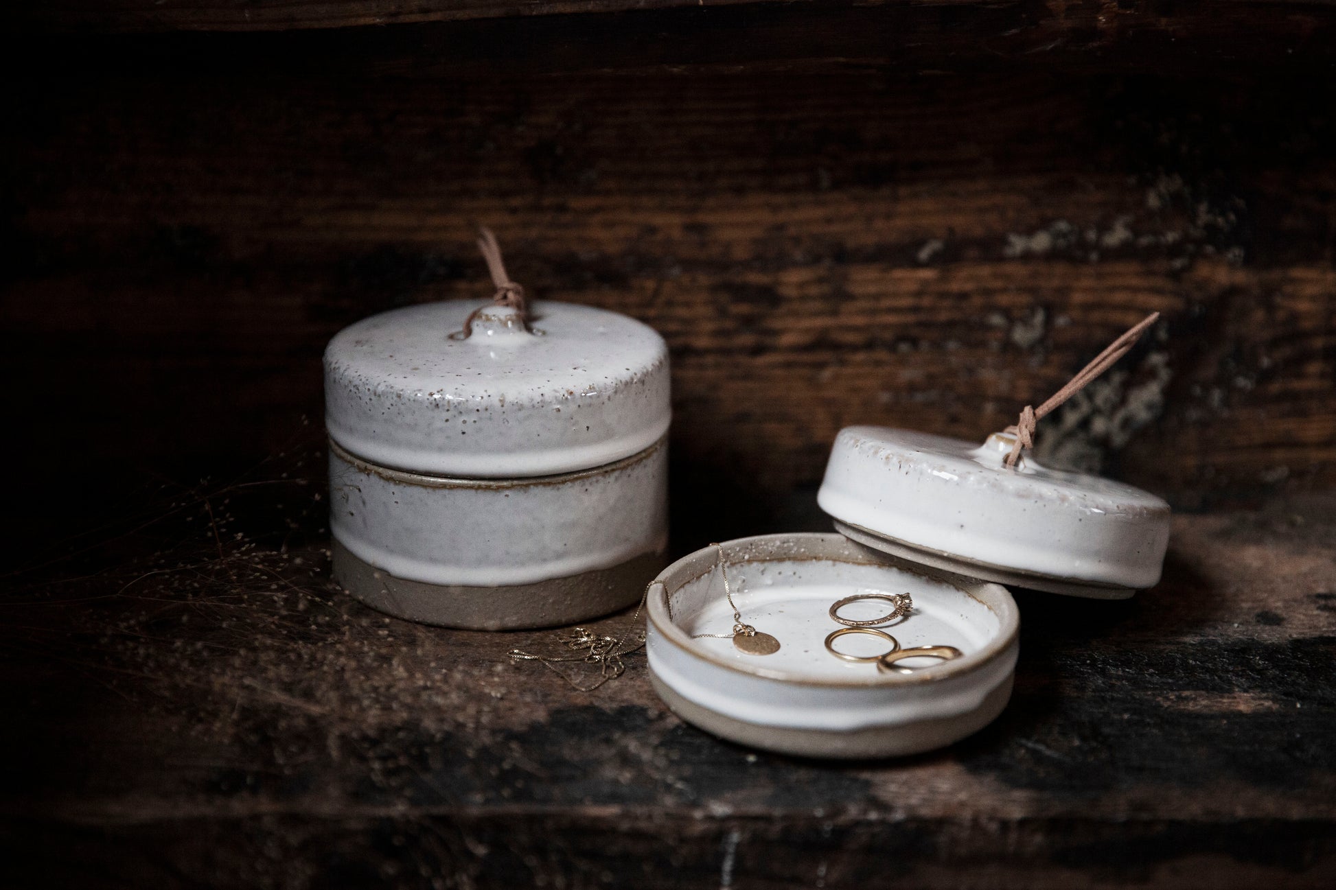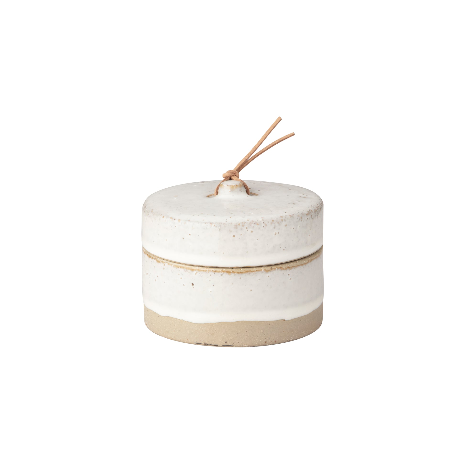 Belle boite de rangement ERNST en grès avec un couvercle muni d'un cordon en cuir, ce qui facilite l'ouverture de la boite.