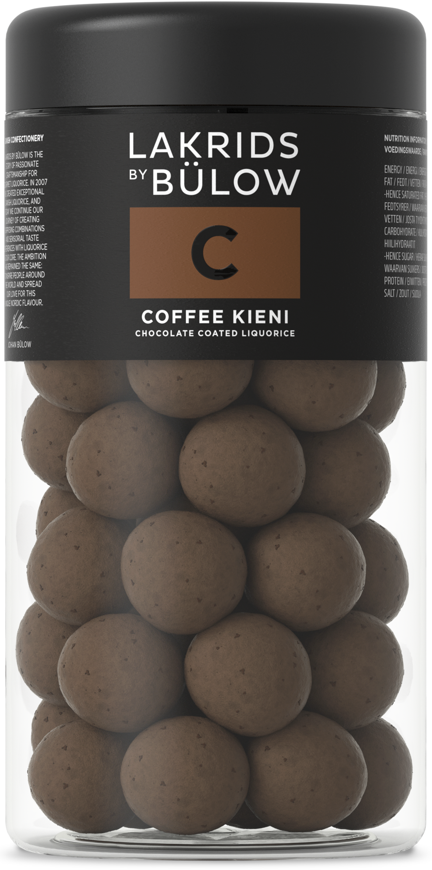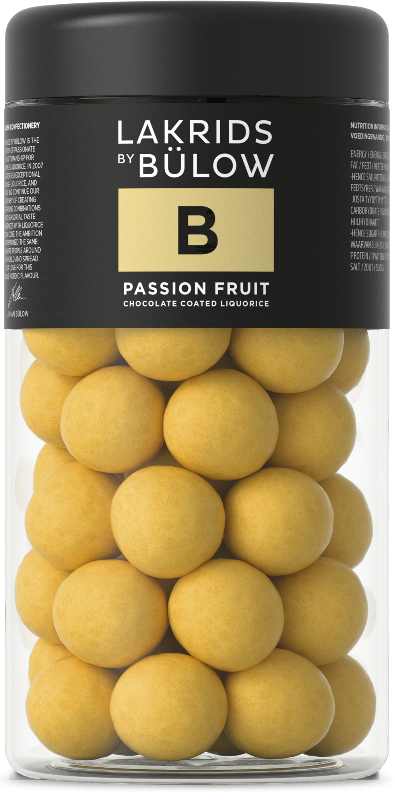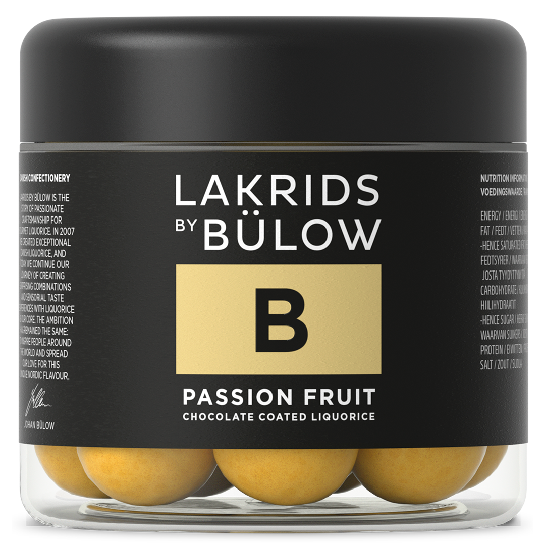 Ingredients: 54% white chocolate (EU) sugar, cocoa butter, whole milk powder, emulsifier (soy lecithin, lecithin), natural vanilla flavour), 21% sugar (EU), rice flour, invert sugar syrup, treacle, glucose syrup, 2% passion fruit (EU) freeze-dried), 1% raw liquorice (non-EU),glazing agents (gum arabic, carnauba wax, shellac), rapeseed il, acid: malic acid, natural favour, salt, colours (calcium carbonate, beta-carotene), stabilizer: gum arabic, anise oil.