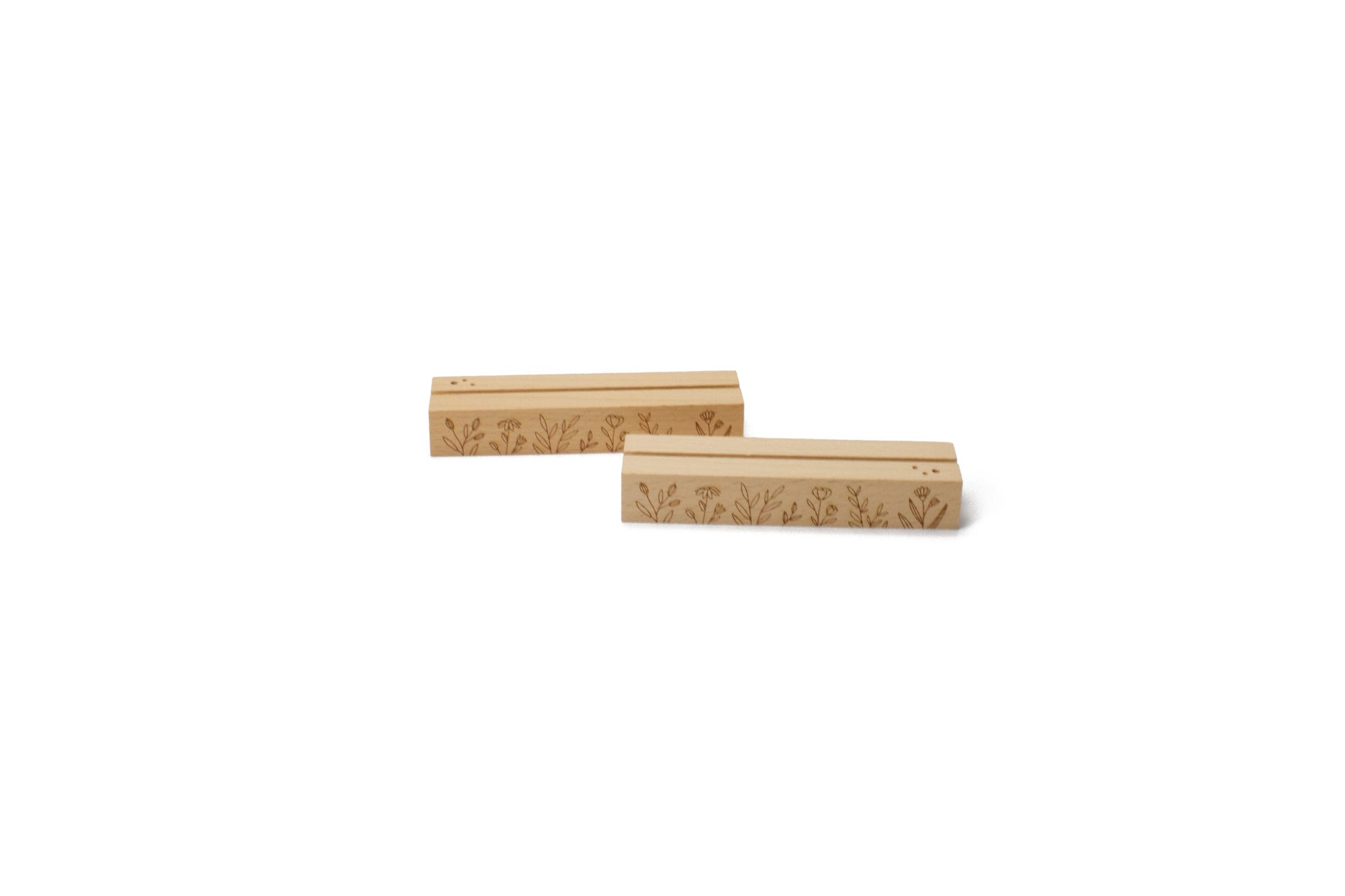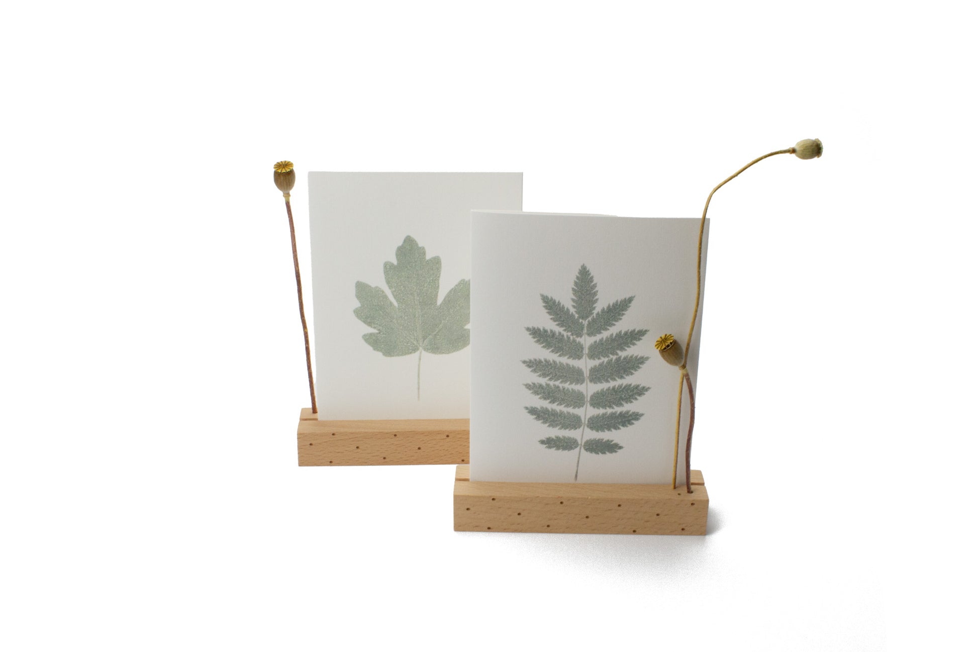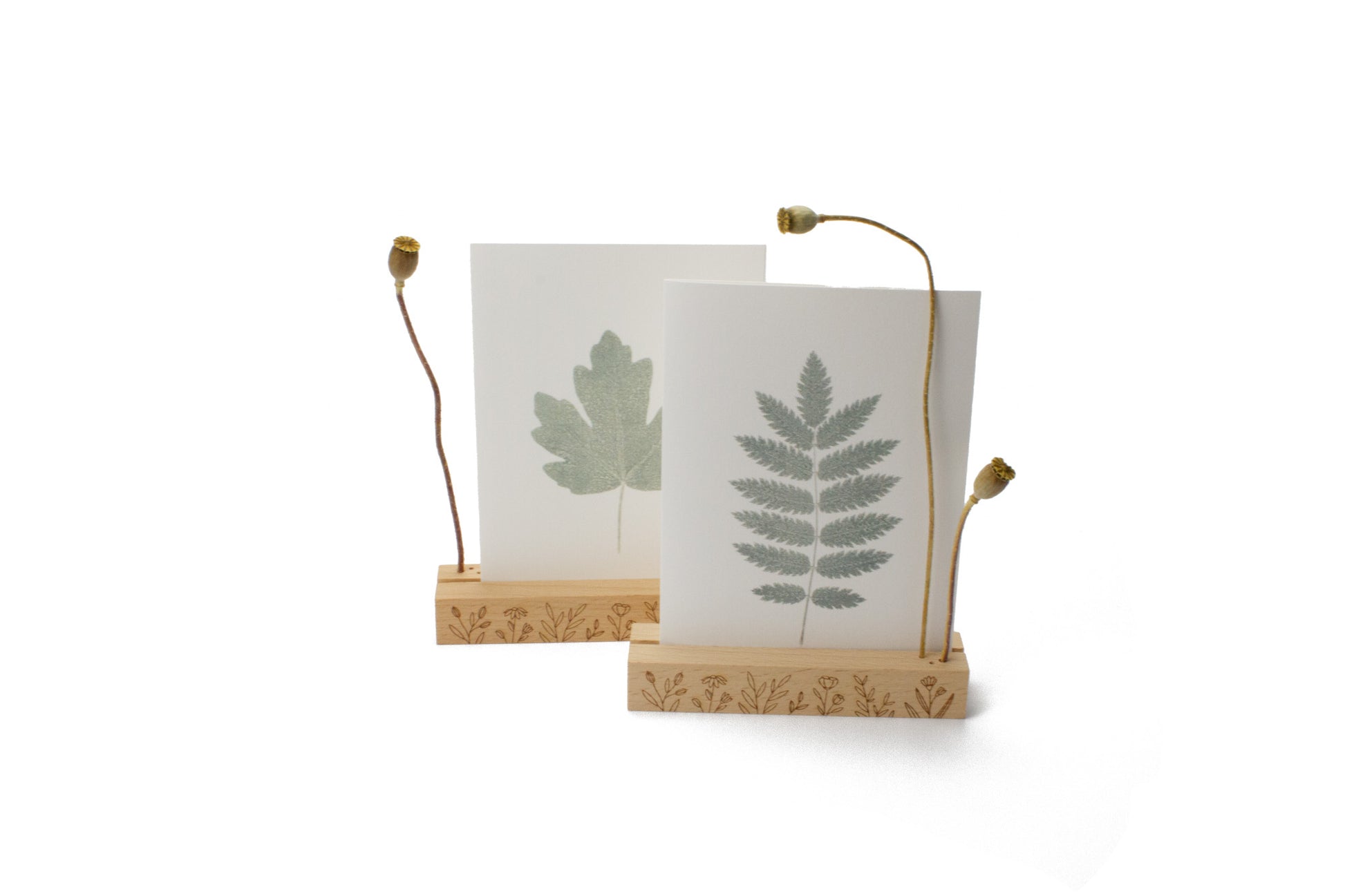 Présentoirs en bois de hêtre, orné d'un dessin fait à la main, avec trois trous pour y glisser les fleurs séchées. Format idéal pour carte postale ou photo.