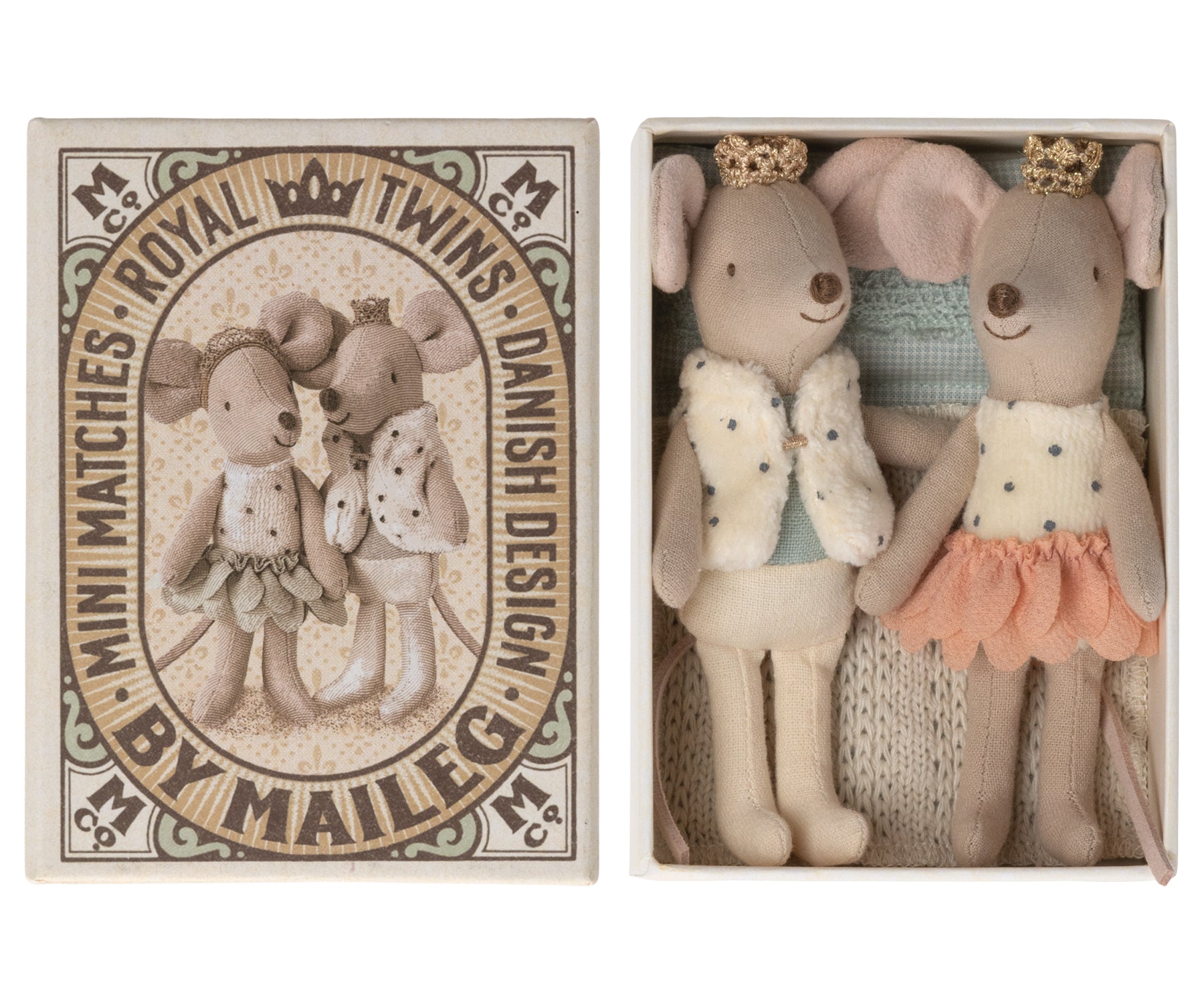 La famille royale des souris en coton et lin s'agrandit avec ses jumeaux. Ils portent des couronnes dorées et de beaux vêtements et dorment dans une jolie boîte d'allumettes.