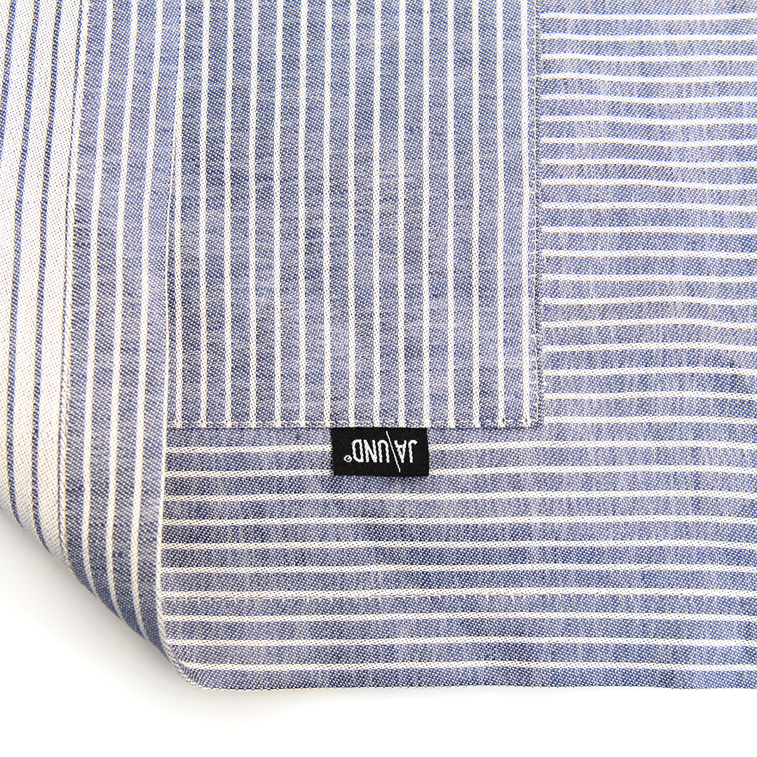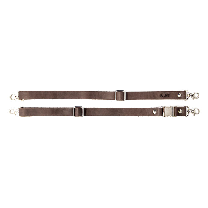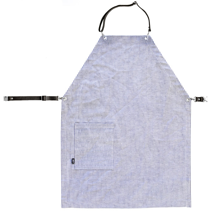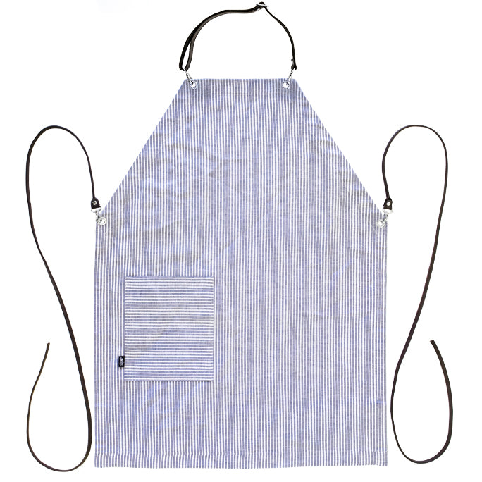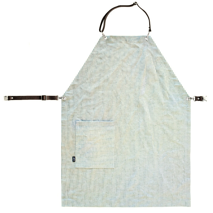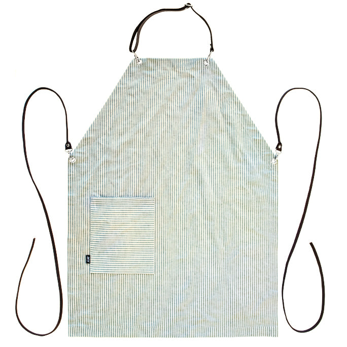 Tablier mi-lin, mi-coton, rayé avec détails en cuir marron et mousqueton.
