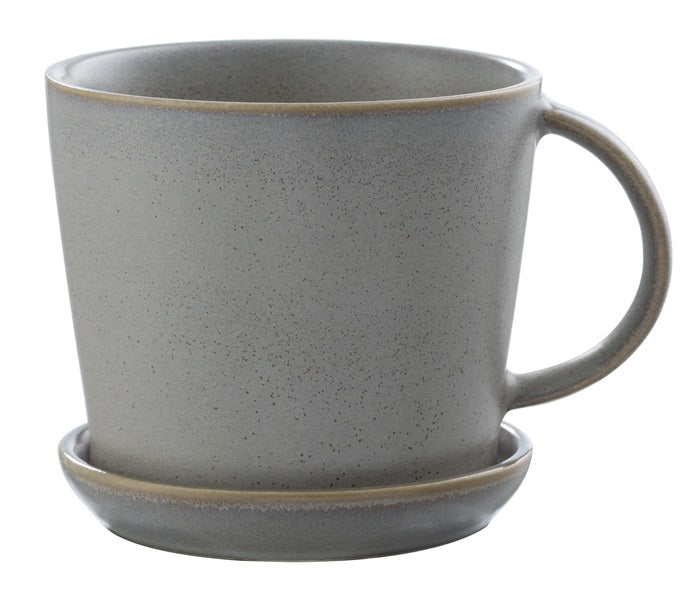 Jolie tasse de couleur gris beige idéale pour le thé du matin, avec sa sous tasse inclue.